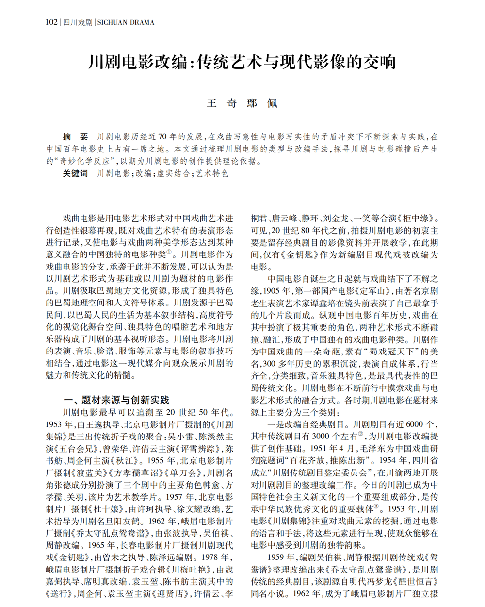 成果推广2丨王奇 鄢佩:《川剧电影改编:传统艺术与现代影像的交响》